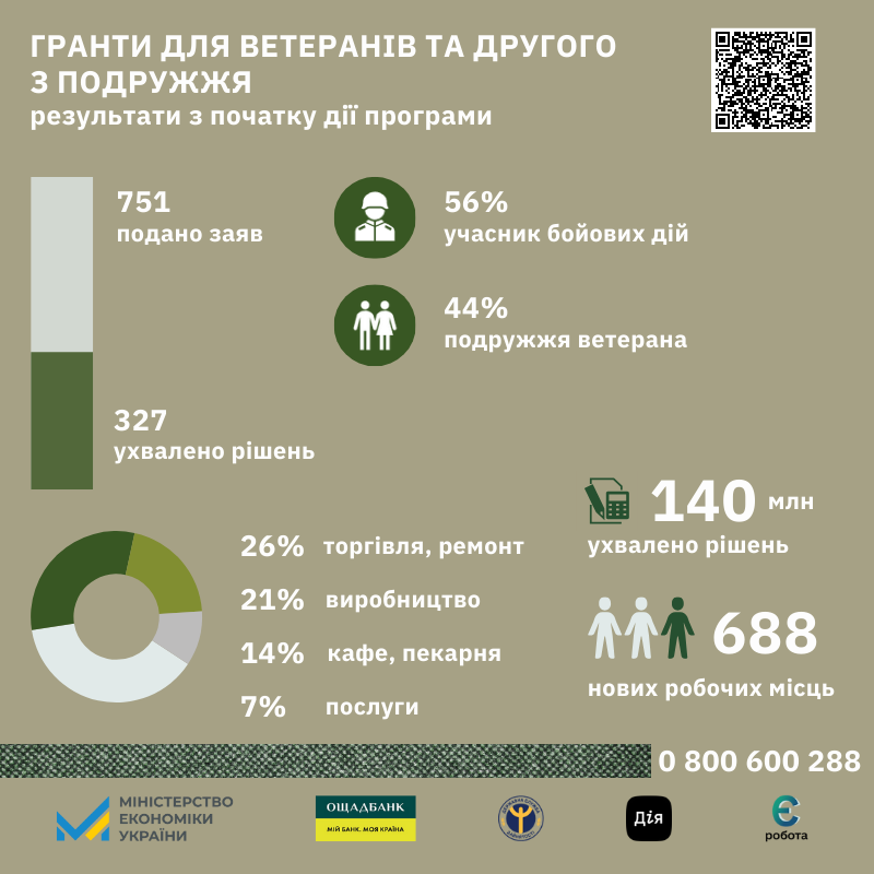 За результатами розгляду заяв було ухвалено 434 позитивних рішень на загальну суму більше 103 млн грн. Передбачається, що отримувачі створять 890 нових робочих місць. Серед регіонів з найбільшою кількостю схвалених заявок у цього разу в лідерах Львівська область (13%), м. Київ (10%), Київська (8%), Івано-Франківська (6%) та Рівненська (6%) області. Переможці здійснюють або планують розпочати свою господарську діяльність переважно в таких видах діяльності: гуртова/роздрібна торгівля та ремонт автотранспорту (33%), тимчасове розміщення й організація харчування (17%), переробна промисловість (14%), надання інших видів послуг (8%), охорона здоров'я та надання соціальної допомоги (7%). Майже 81% отримувачів вже мають діючий бізнес, із них фізичні особи-підприємці складають трохи більше 73%, а юридичні особи - 7%. Більше 61% фізичних осіб та ФОП становлять жінки. Мають досвід роботи у напрямі реалізації власної справи: більше 1 року - більше 65% фізичних осіб, до 1 року - майже 24%. Більше 74% отримувачів мають вищу освіту, 11% - середню спеціальну (технікум, коледж). Детальна статистика за даний період подання заяв, а також з початку року зазначена у нашій інфографіці, розташованій нижче.