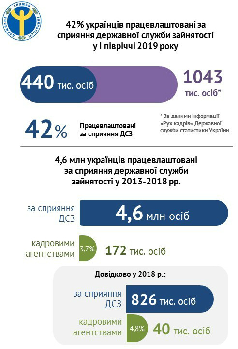 За даними Держстату у першому півріччя 2019 року 1 млн. 43 тис. українців були прийняті на роботу. При цьому державна служба зайнятості (ДСЗ) працевлаштувала 440 тис. людей або 42% від загального числа офіційно оформлених працівників. Але ми пішли далі і спробували порівняти результати нашої роботи з приватними агентствами зайнятості та job-search порталами.