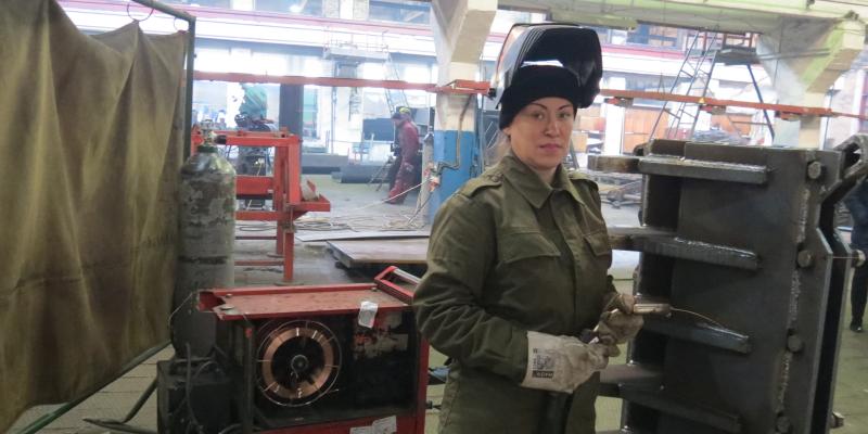 Переселенка з Донецька Наталя Ганцура працевлаштована службою зайнятості електрозварником і є єдиною жінкою в колективі.